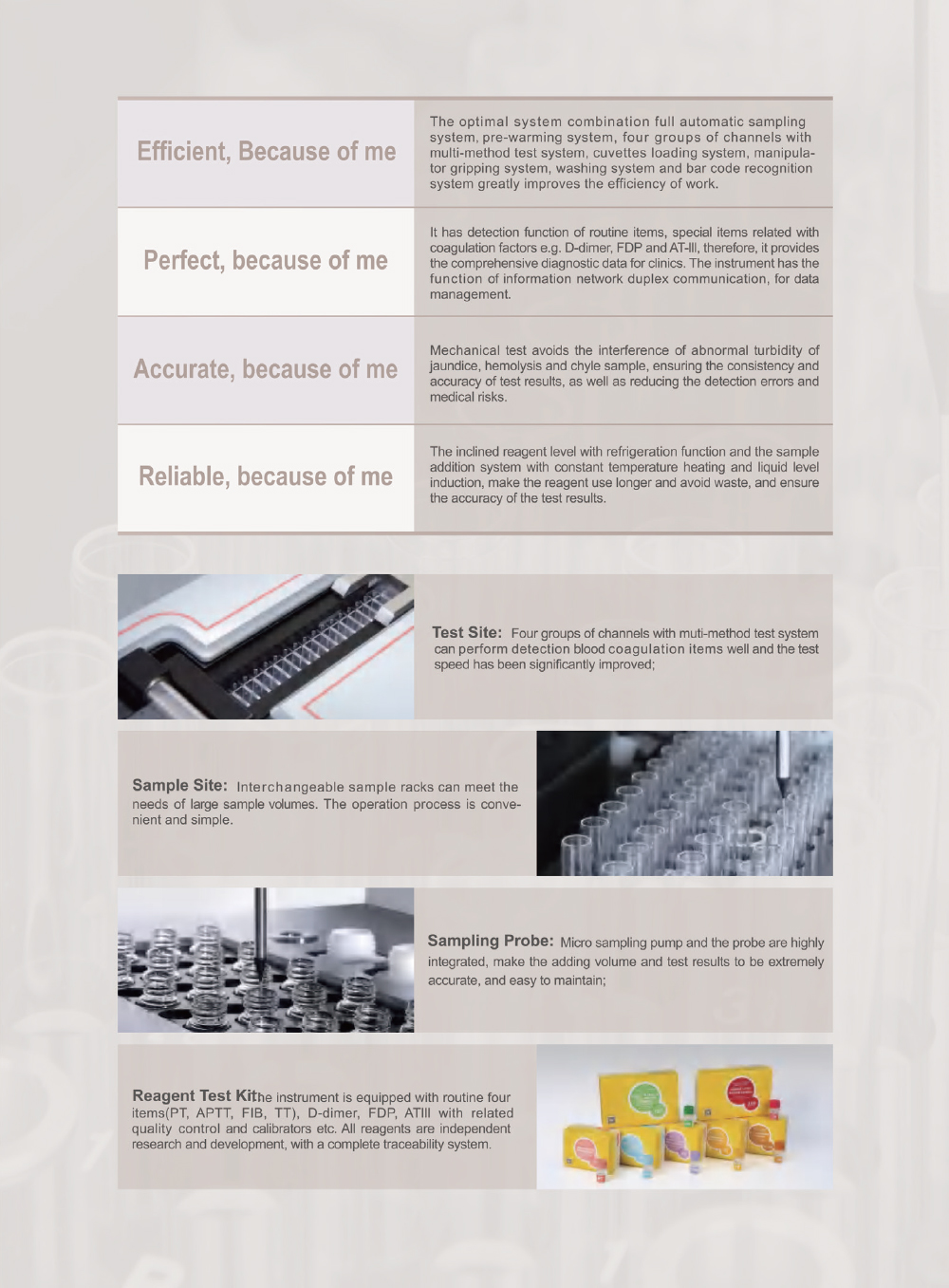 Detecta diferentes elementos de coagulación sanguínea con precisión mediante inmunoturbidimetría de coagulación (mecánica + óptica) y el método de sustrato cromogénico.